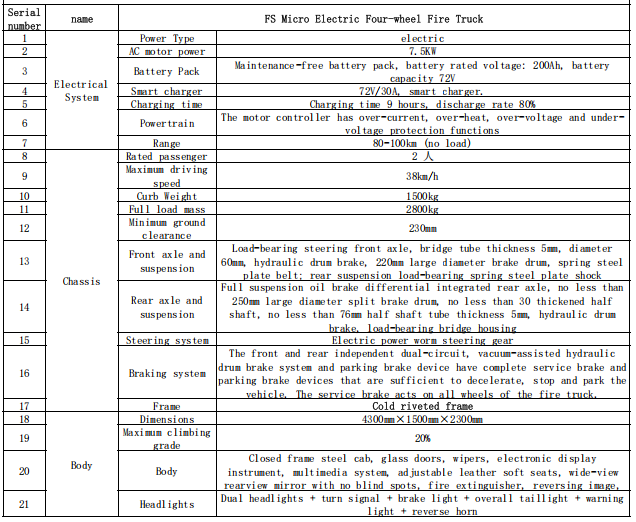 பூஜ்ஜிய உமிழ்வு மற்றும் குறைந்த இரைச்சல் அளவுகளுடன், இது குடியிருப்பு பகுதிகள் போன்ற முக்கியமான பகுதிகளுக்கு ஏற்றது. அதன் நெகிழ்வான அளவு குறுகிய பகுதிகளை ஊடுருவ அனுமதிக்கிறது. அதன் குறைந்த கொள்முதல் மற்றும் இயக்க செலவுகள் பராமரிப்பதை எளிதாக்குகின்றன. உபகரணங்கள் ஆரம்ப கட்ட தீக்கு ஏற்றவை மற்றும் விரைவாக கையாளப்படலாம். இது ரோந்துகள், விளம்பரம் மற்றும் அவசரகால உதவிகளுக்கும் பயன்படுத்தப்படலாம், இது அடிமட்ட தீயணைப்புக்கு மிகவும் பயனுள்ள கருவியாக அமைகிறது.