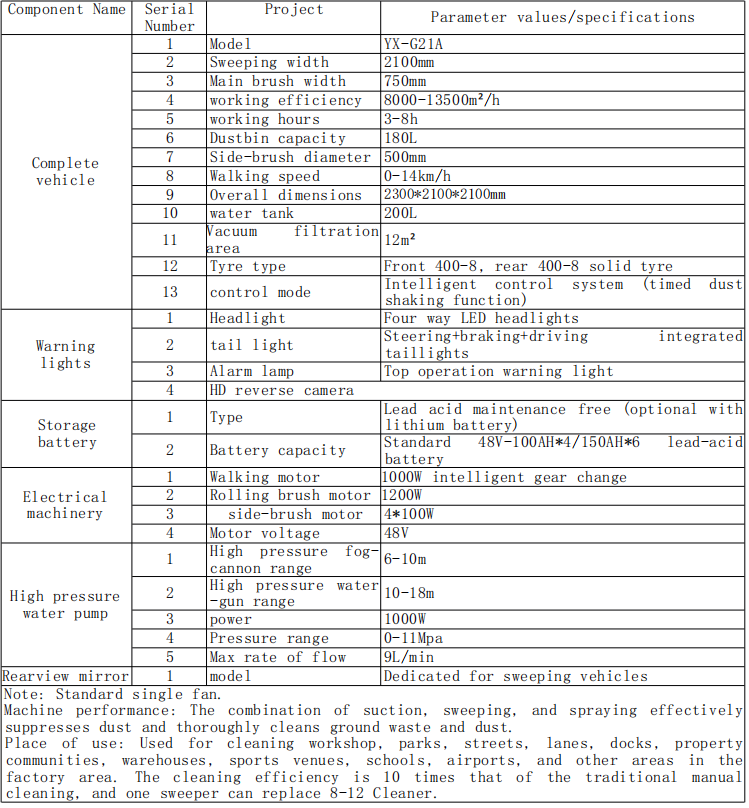 பயன்பாட்டு இடம்: பட்டறை, பூங்காக்கள், வீதிகள், பாதைகள், கப்பல்துறைகள், சொத்து காமனிட்டுகள், கிடங்குகள், விளையாட்டு இடங்கள், பள்ளிகள், விமான நிலையங்கள் மற்றும் பல பகுதிகளில் உள்ள பிற பகுதிகளுக்கு சுத்தம் செய்யப் பயன்படுகிறது. துப்புரவு திறன் பாரம்பரிய கையேடு கிளீனிங் செய்வதை விட 10 மடங்கு ஆகும், மேலும் ஒரு ஸ்வீப்பர் 8-12 கிளீனரை மாற்ற முடியும்