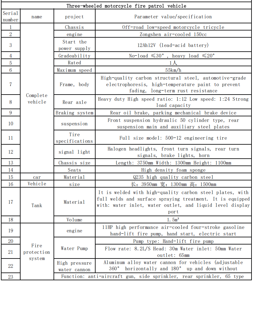 குறைந்த தரமான கிராமப்புற சாலைகள் மற்றும் தீயணைப்பு நிலையங்களிலிருந்து நீண்ட தூரம் ஆகியவற்றைக் கருத்தில் கொண்டு, மூன்று சக்கர தீயணைப்பு மோட்டார் சைக்கிள்களை டவுன்ஷிப் தொழில்முறை தீயணைப்பு படைப்பிரிவுகளின் முக்கிய உபகரணங்களாகப் பயன்படுத்தலாம். அவர்கள் இரு சக்கர வாகனங்களை விட அதிகமான பொருட்களை எடுத்துச் செல்ல முடியும் மற்றும் நான்கு சக்கர தீயணைப்பு வீரர்களைக் காட்டிலும் சிக்கலான சாலை நிலைமைகளுக்கு ஏற்றவாறு மாற்றியமைக்க முடியும், இது "அருகிலுள்ள பொலிஸ் அனுப்புதல் மற்றும் விரைவான அகற்றல்" என்பதை உணர்ந்துள்ளது.